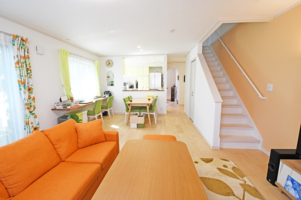▲リビングと階段はオレンジで統一されてさわやかに