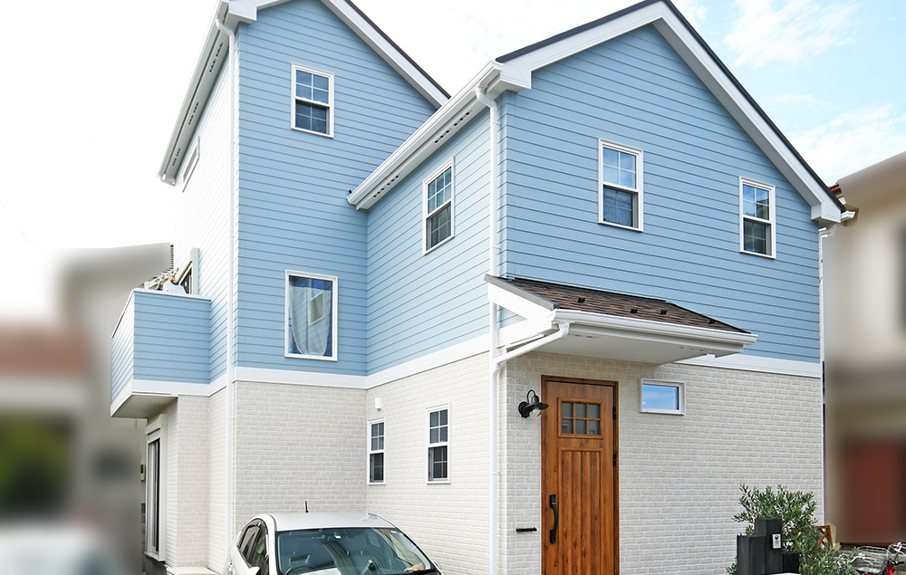 ▲さわやかなブルー×ホワイトのツートーンカラーの外壁。