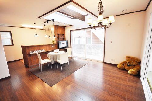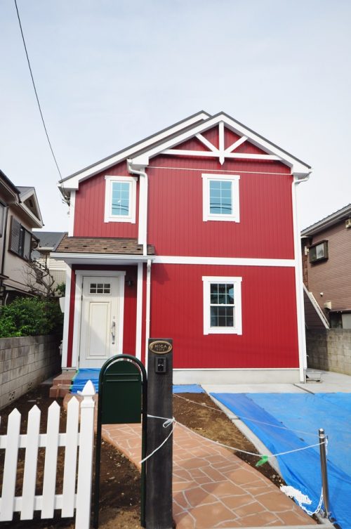 モデルハウスに似たイメージの赤い外壁に内装は、しっとりと落ち着いたアンティーク調で仕上げています。木の部分はこげ茶で塗装