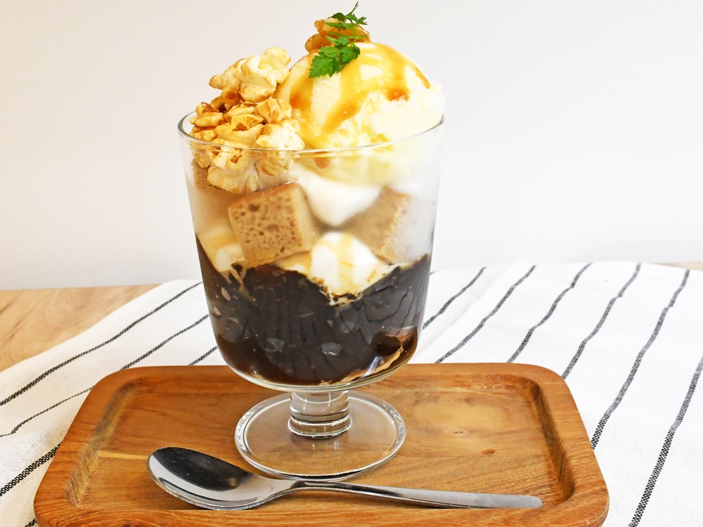 コーヒースポンジや生クリーム、バニラアイスの上にキャラメルソースをかけて