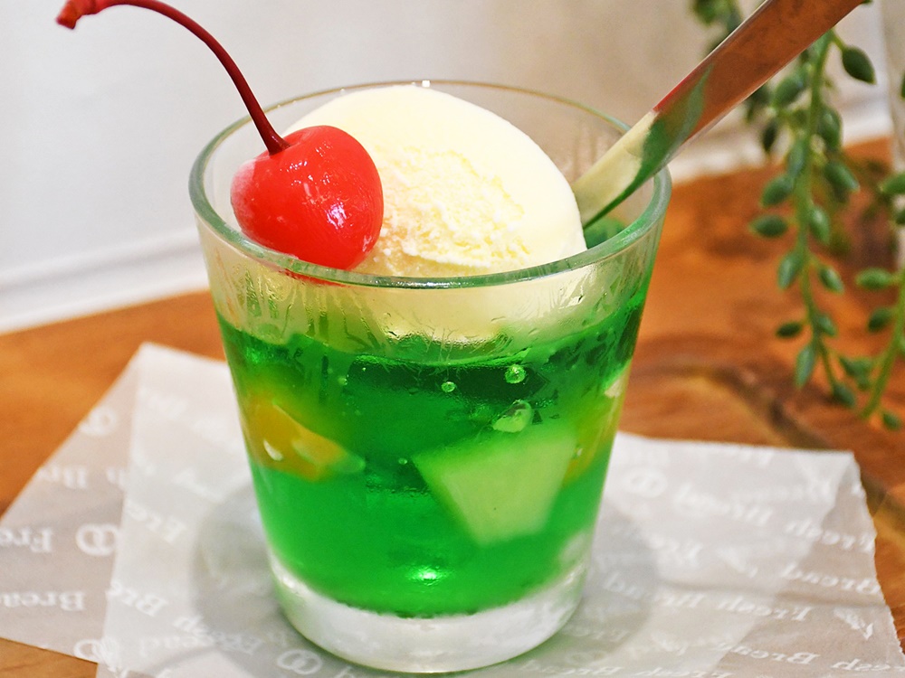 ほのかに炭酸を感じるメロンソーダのゼリーにバニラアイスを乗せて、