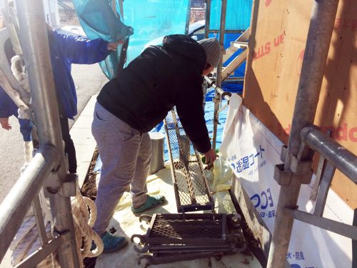 お家の四隅に、お酒と塩とお米をまいていきます。