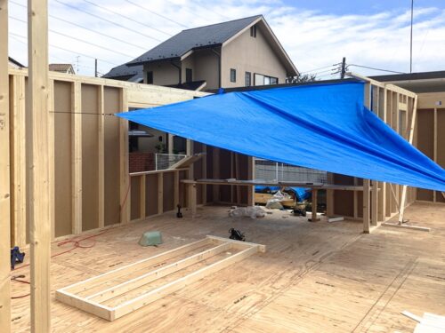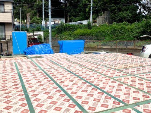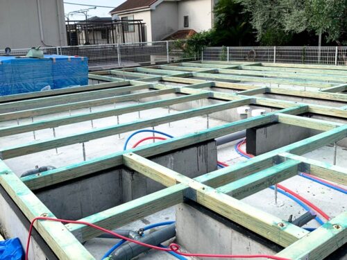 まずは、防蟻の炭を塗った基礎の上に、防蟻を塗布した土台を敷いていきます。