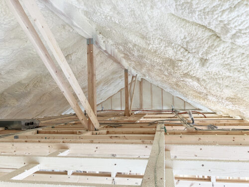 屋根の遮熱材を入れた後に断熱材を吹き付けます。