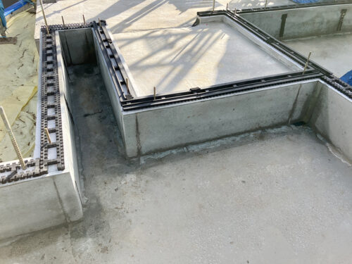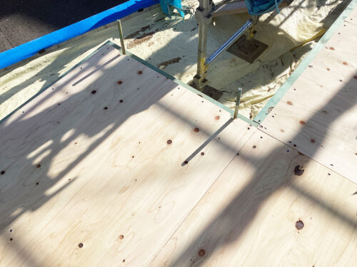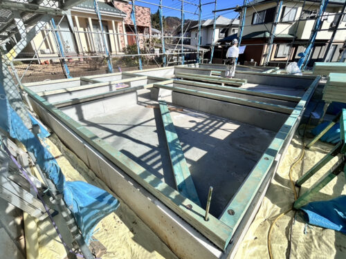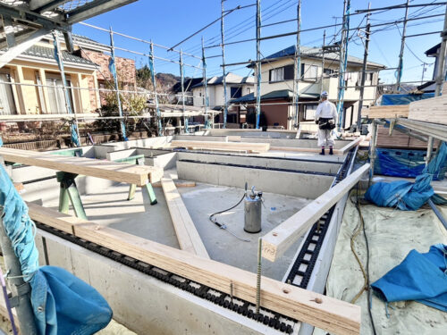 まずは、防蟻の炭を塗った基礎の上に、防蟻を塗布した土台を敷いていきます。