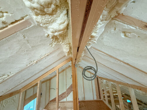 屋根の遮熱材を入れた後に断熱材を吹き付けます。