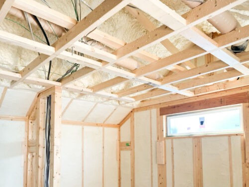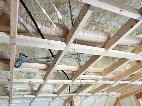 屋根の遮熱材を入れた後に断熱材を吹き付けます。