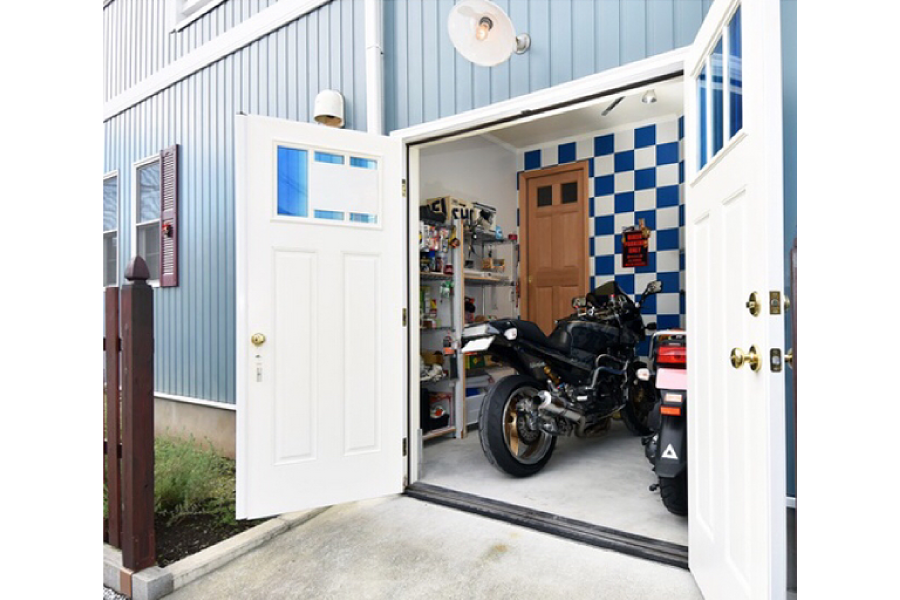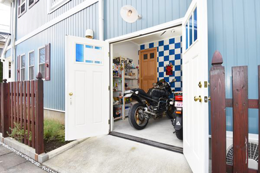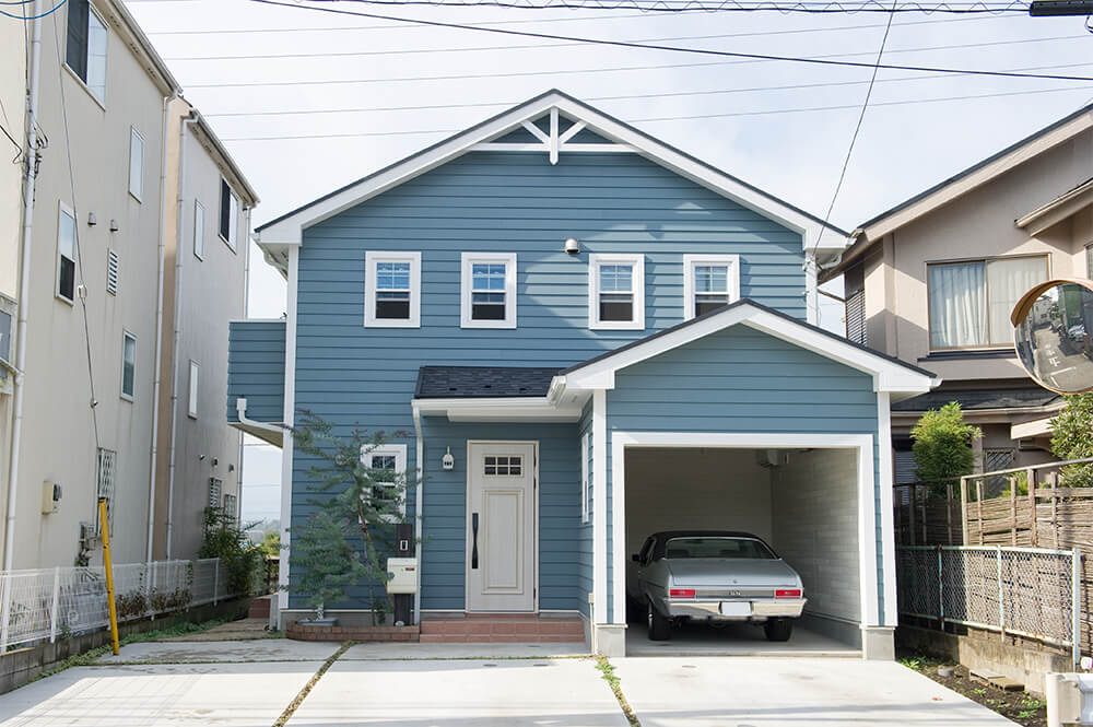 輸入電動式オーバードアが付いたおしゃれなビルトインガレージはアメリカンならではの個性あふれるデザインです。愛車や趣味の道具をしまっておくのにも便利、輸入のオーバードアがひときわ目を引くデザイン性の高いガレージです。