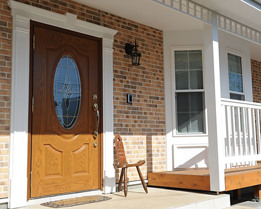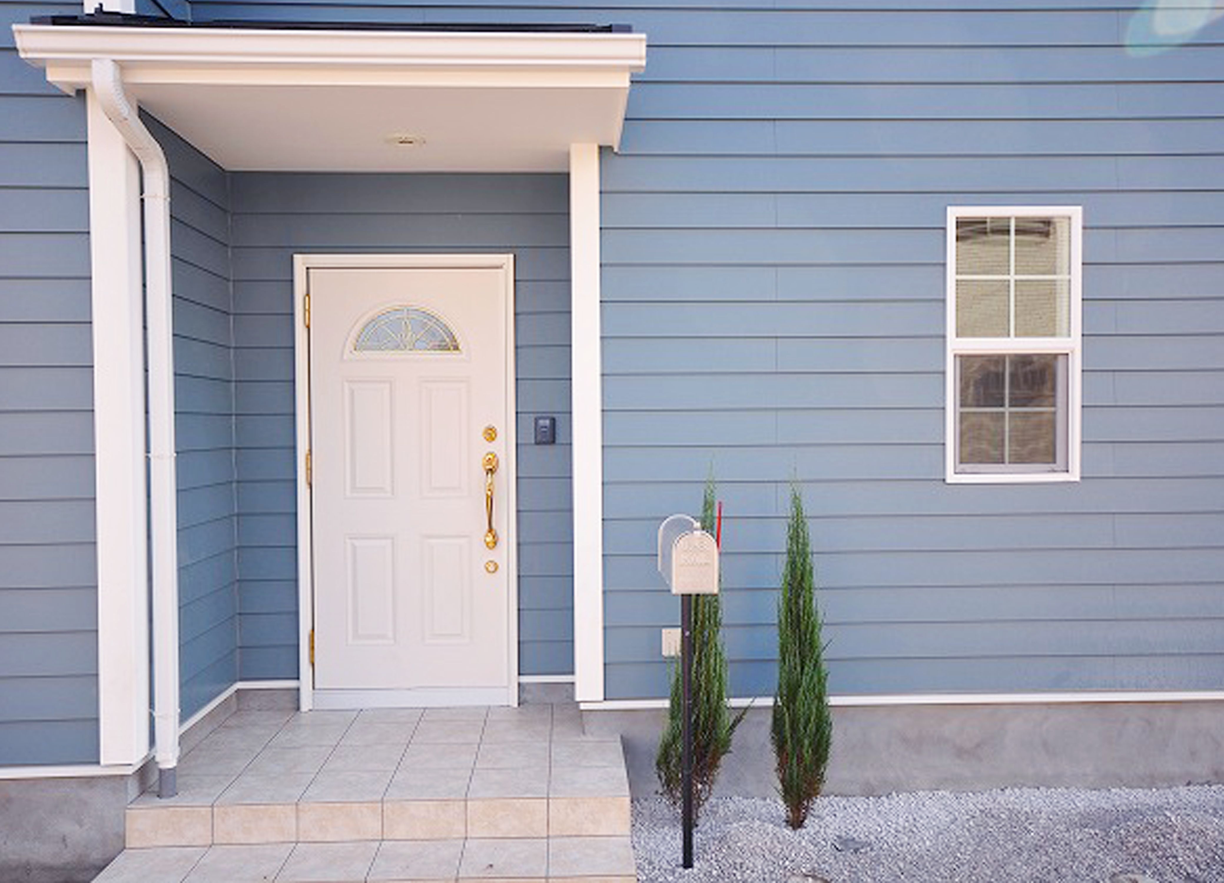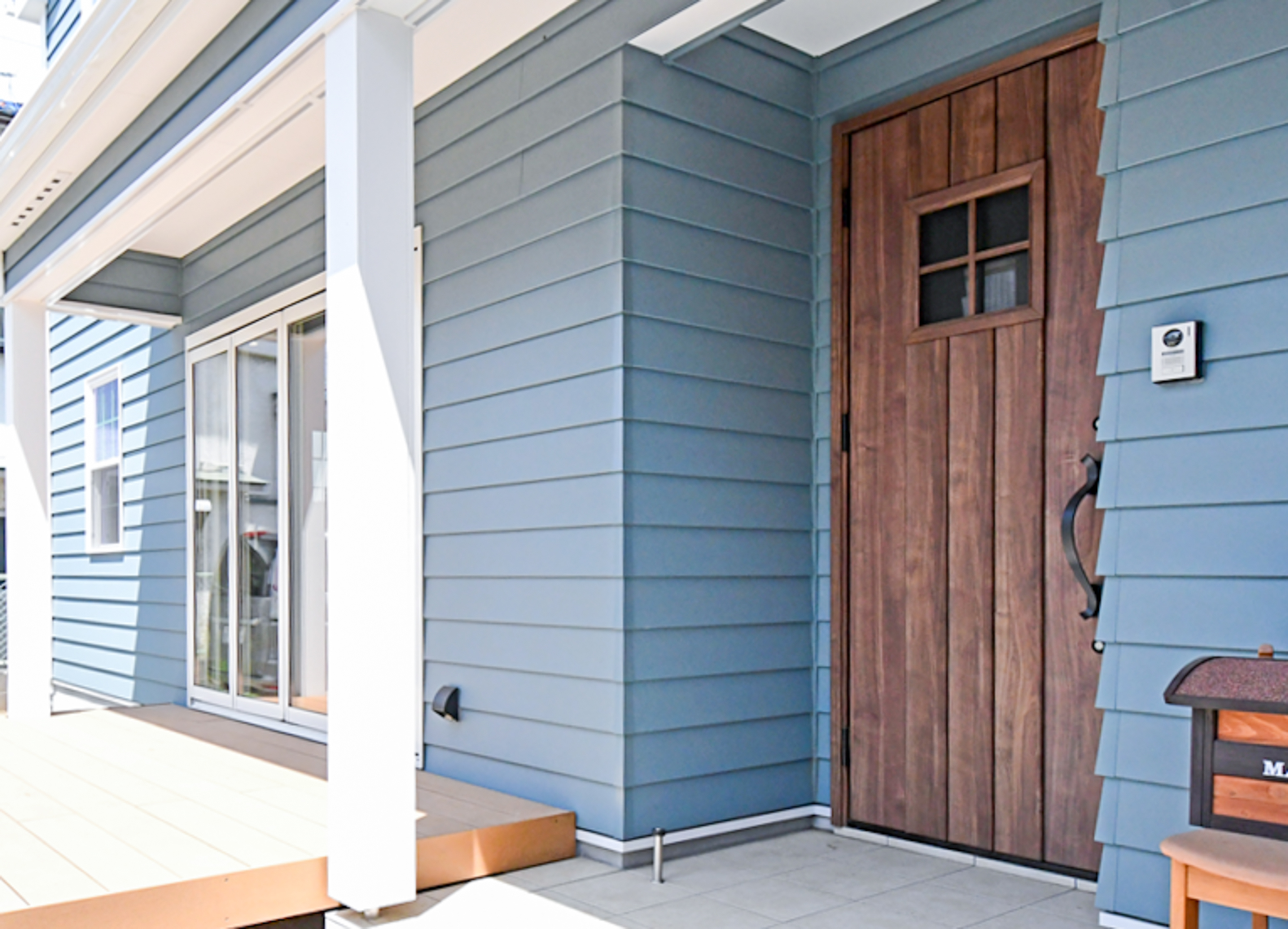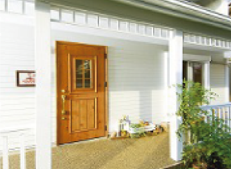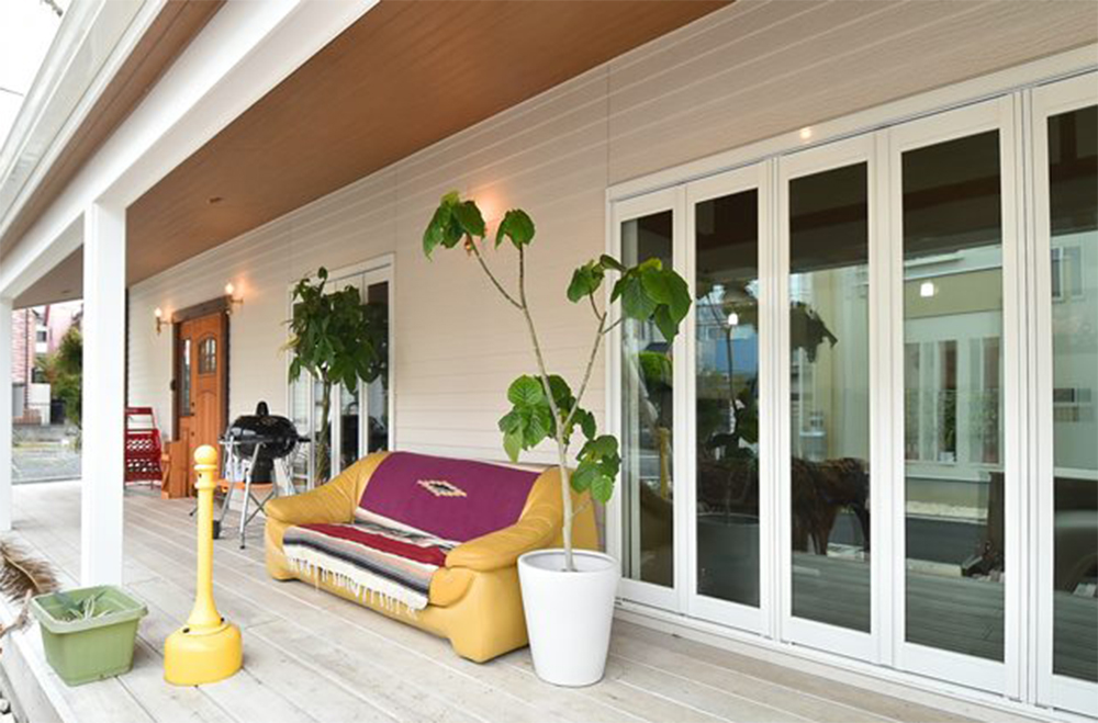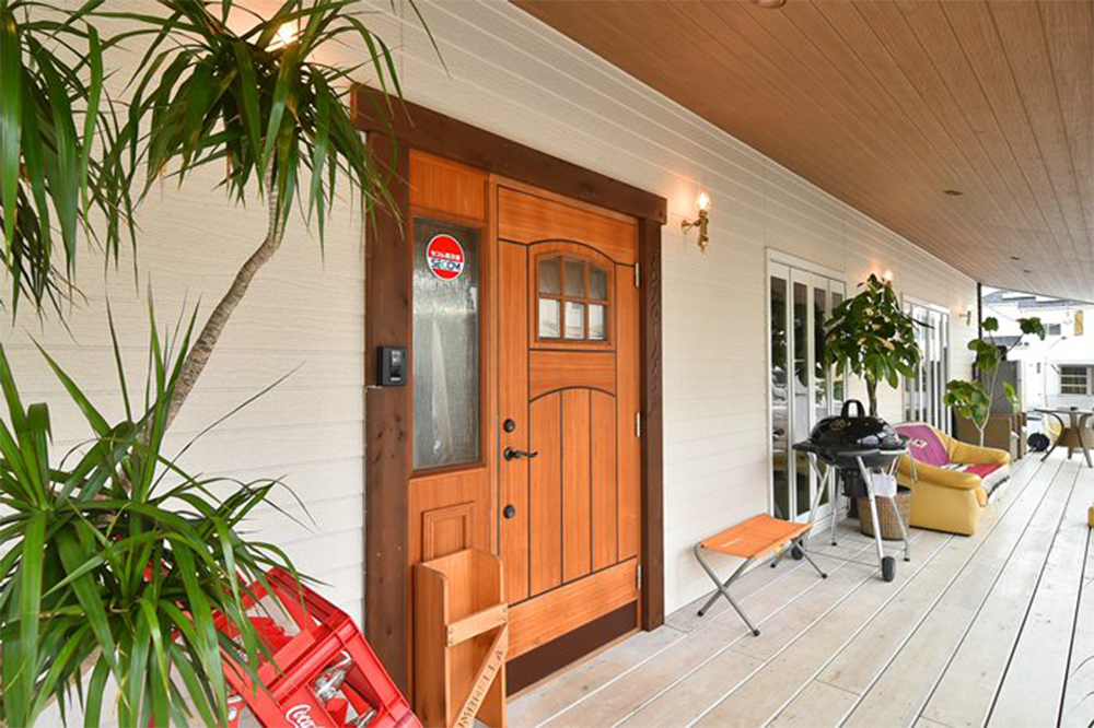 アメリカン住宅に良く似合うカバードポーチ。ポーチ柱や軒飾りを付けると華やかな雰囲気に。建物をさらにランクアップしてくれます。