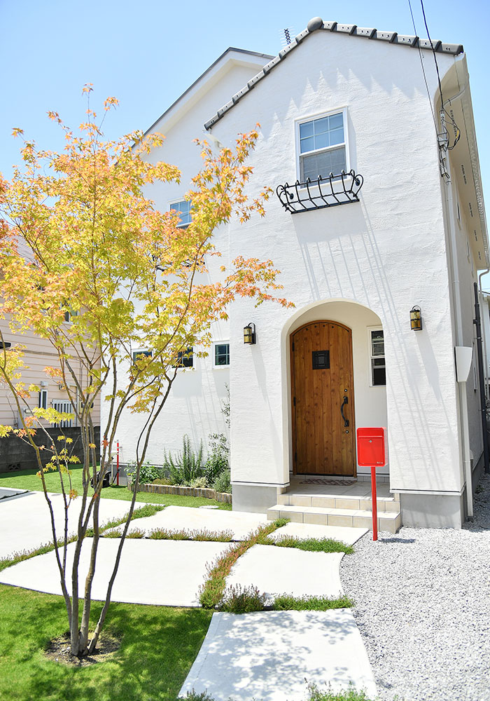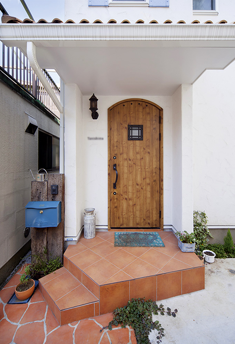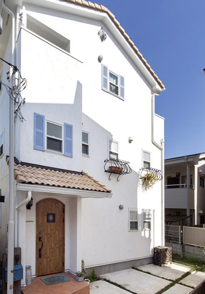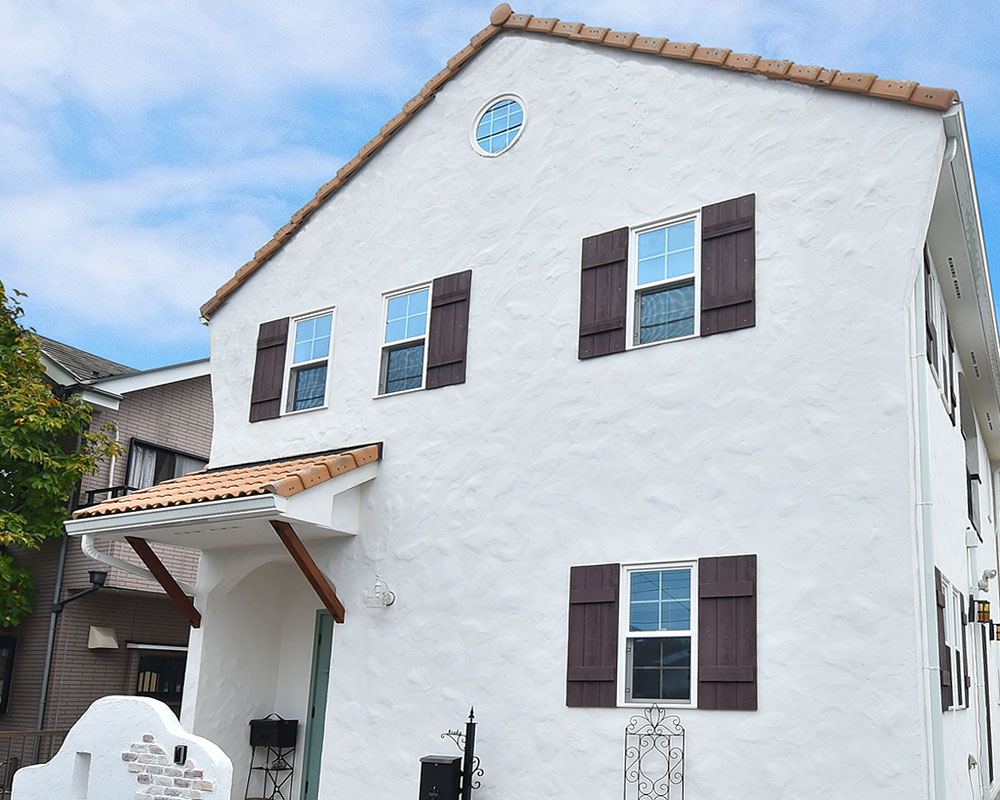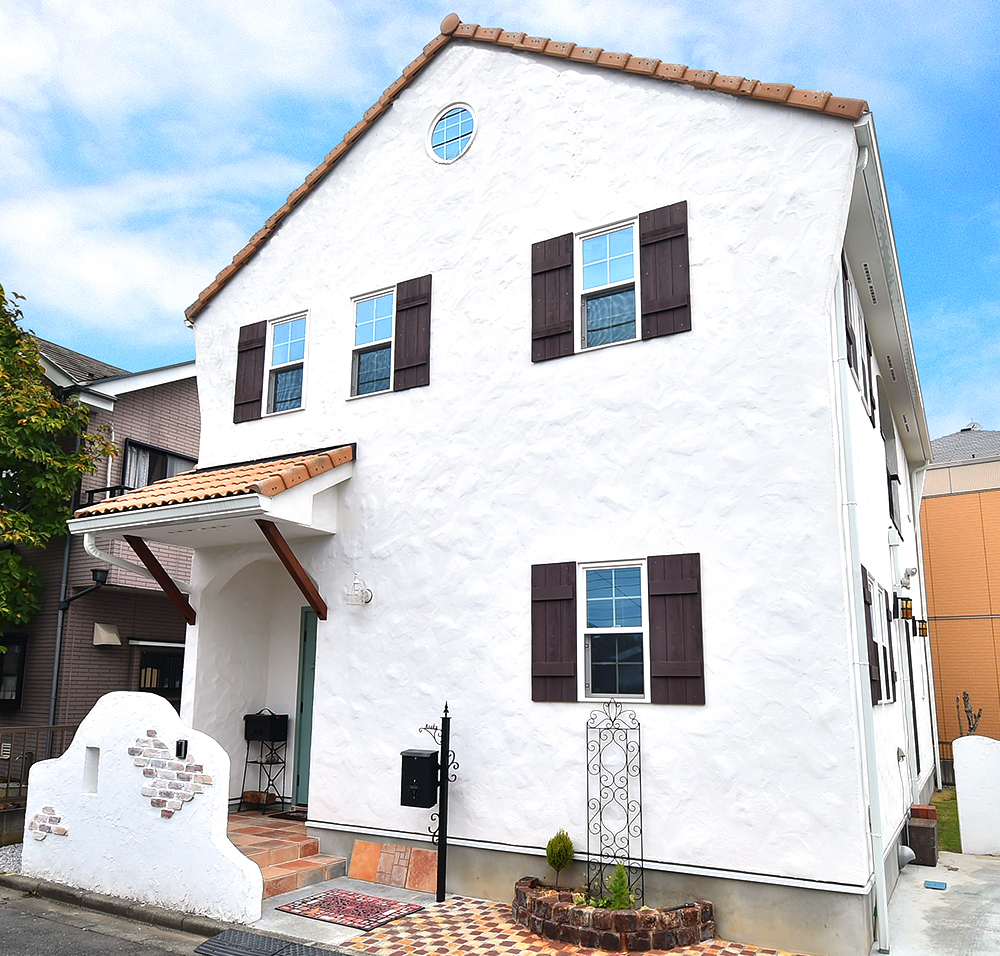 漆喰のコテ跡と洋瓦が明るい趣のプロヴァンスのスタイル。