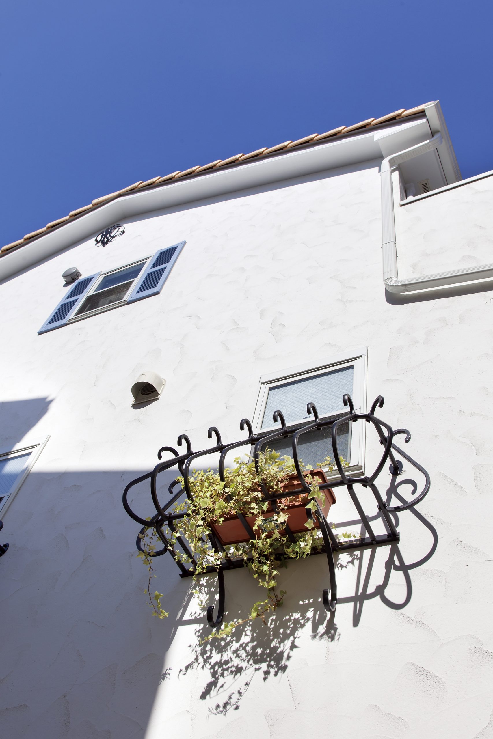 奥様こだわりの空色のルーバー飾りやアイアンのフラワーボックス。