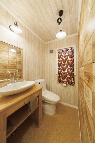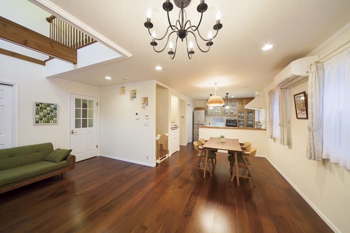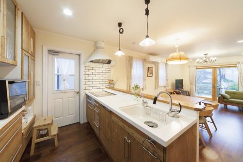 奥様がこだわったキッチンはカウンターとキャビネットがおそろいのオリジナル木製輸入キッチンです。