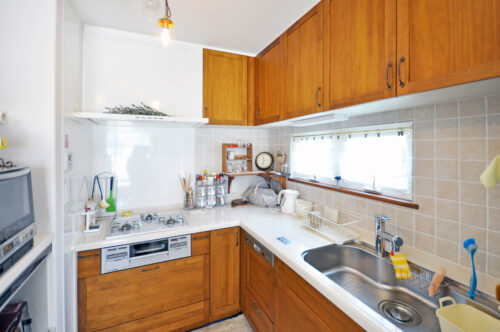 ▲かわいいタイルを壁に貼ったL型キッチン