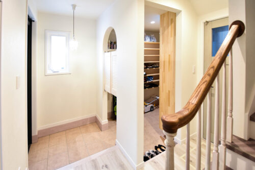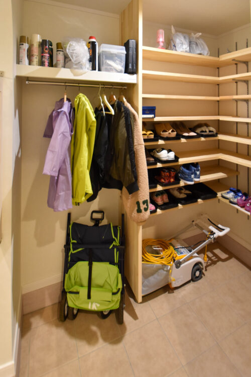 ▲洋服もかけられる広々シューズクロークのついた玄関