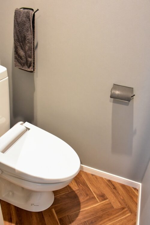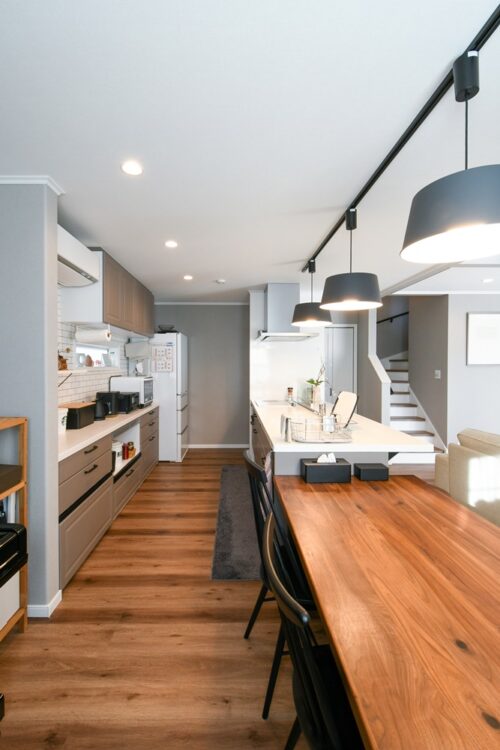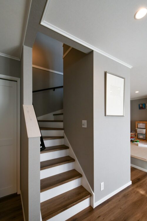 ▲グレーの壁にブラウンの床・階段で落ち着きのある空間に統一されています