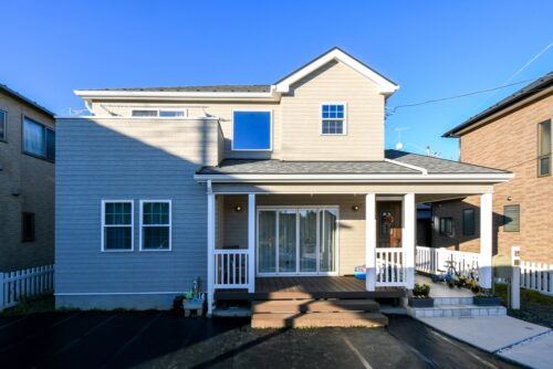 ▲外観はカバードポーチのあるアメリカンデザインのおうちです