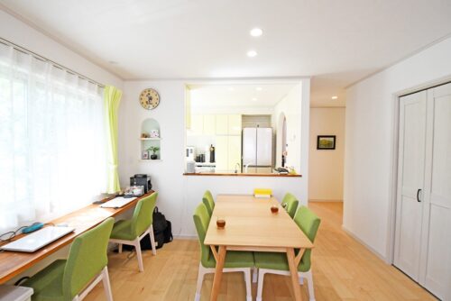 ▲グリーンのファブリックがアクセントのダイニングスペース