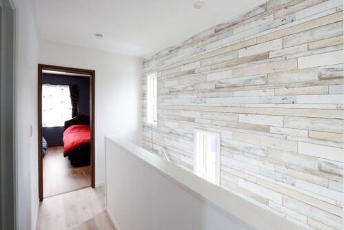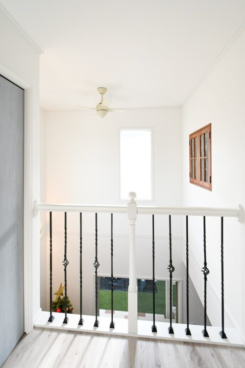 ▲吹抜けの手摺は輸入のアイアンで豪華に、寝室からつながる内窓も素敵