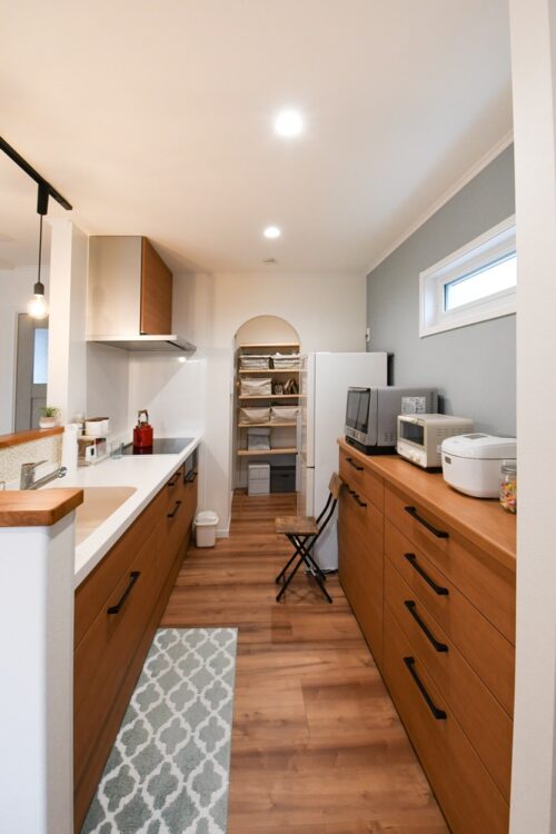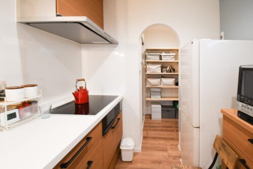 ▲トイレの横には便利な収納と、上には飾るスペースも