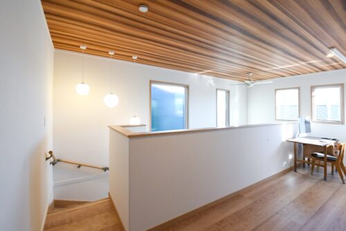 ▲吹抜け横の2Fホールは開放的な空間でゆったりした時間を楽しめます