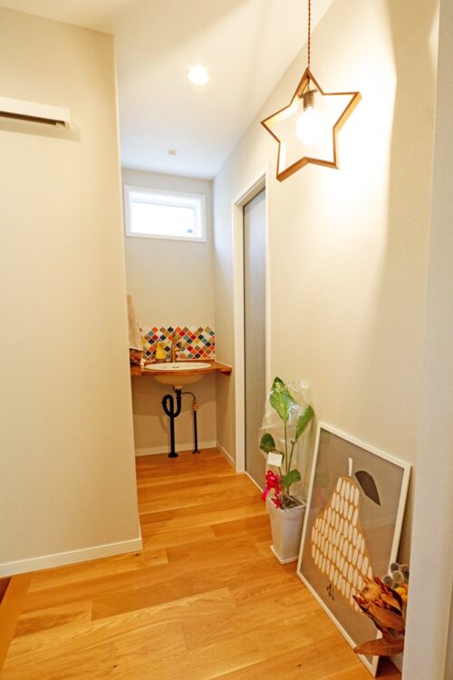 ▲玄関ホール横にはタイルの可愛いお帰り手洗い