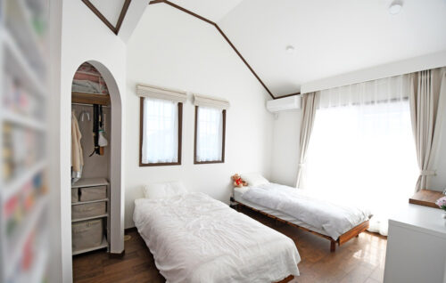 ▲勾配天井で広々の寝室