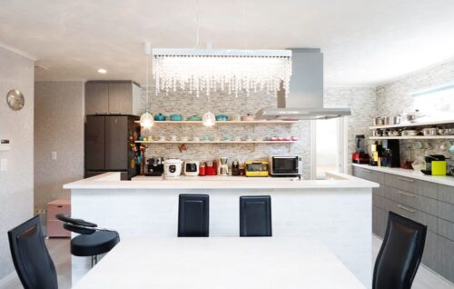 ▲キッチン周りをぐるっと回れるアイランドキッチン