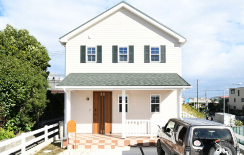 ▲グリーンの窓飾りをアクセントにしたアメリカンデザインの外観
