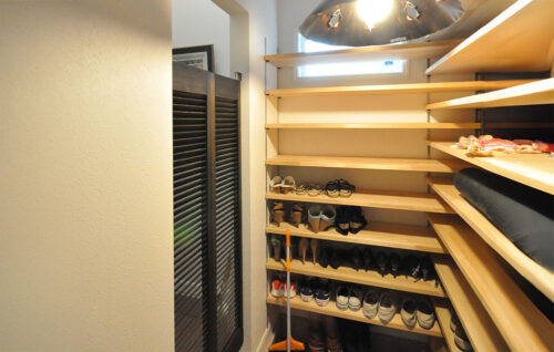 ▲大容量のシューズクロークは、黒塗装した無垢の木のルーバー扉を