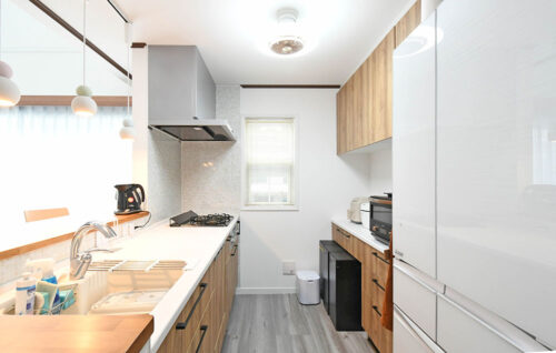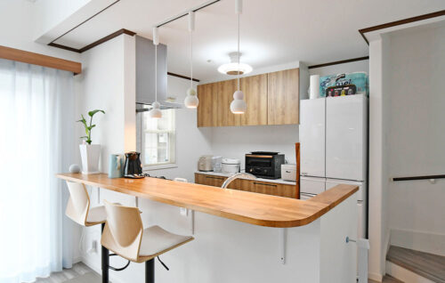 ▲キッチンは作業動線が短いⅡ型キッチン。大きな収納スペースを確保