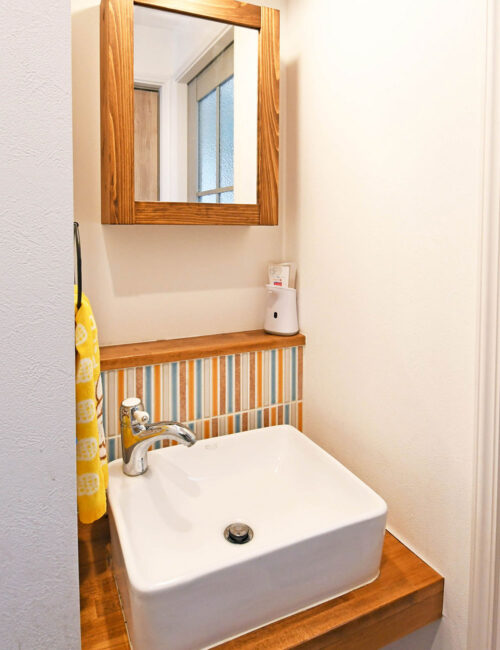 ▲完全オーダーメイドのタイルの手洗いが可愛い。