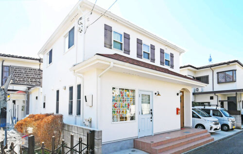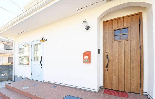 ▲オフホワイトの塗り壁に南欧の雰囲気の外観