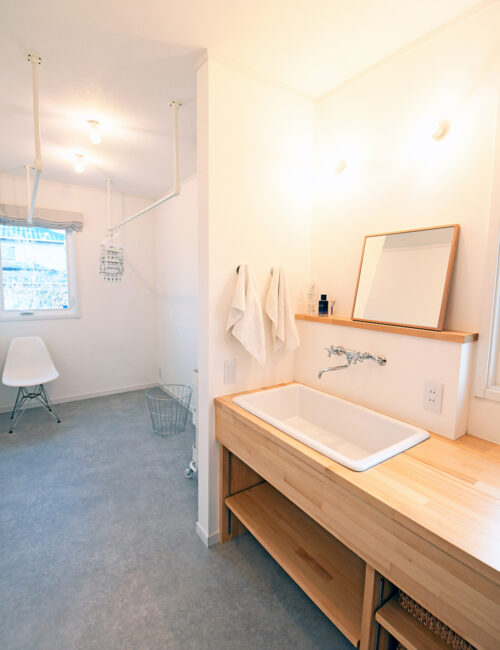 ランドリーにある白のアイアン物干がとてもお洒落♪