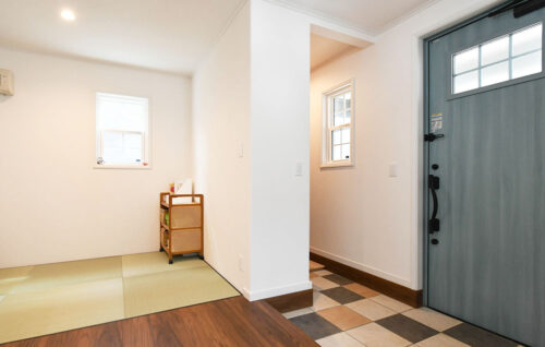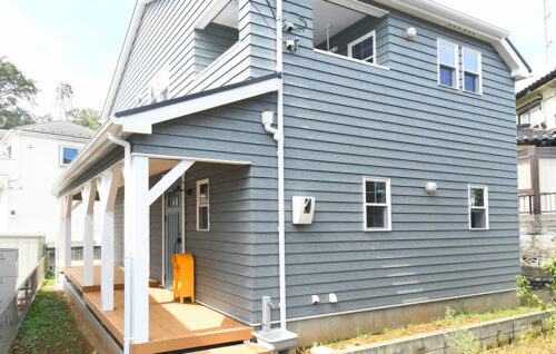 グレイッシュブルーの外壁に、白のポーチの柱が印象的です。