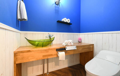 ▲広めのトイレに造作カウンターと素敵な手洗いボール。