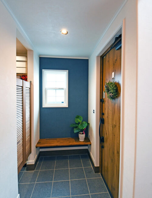 ▲とても広いシューズクロークの入口はウォルナット色のウェスタンドア。
