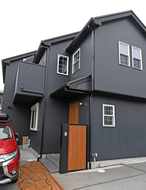 ▲縦ラインの濃紺のサイディングに白いサッシをコーディネート。