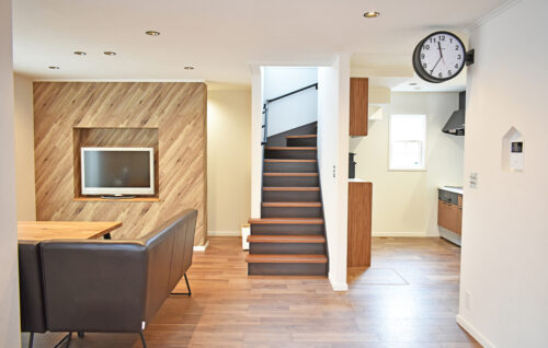 大きな吹抜けには、家の雰囲気に合ったウォールナット色の梁。