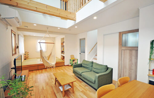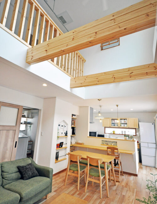 ▲開放的な吹抜けは梁と造作手摺をおなじ雰囲気の面材で♪