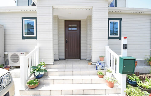 ヴィンテージ感のあるブラウン調の玄関扉で外観が引き締まった印象に。