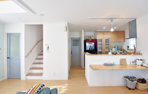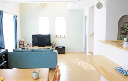 ▲リビングは淡いブルーのアクセントクロスで可愛くて心地よい空間に