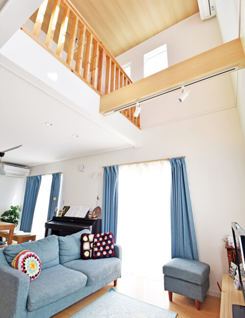 ▲開放的で大きな吹抜けは造作手摺を採用。雰囲気にあった面材で♪