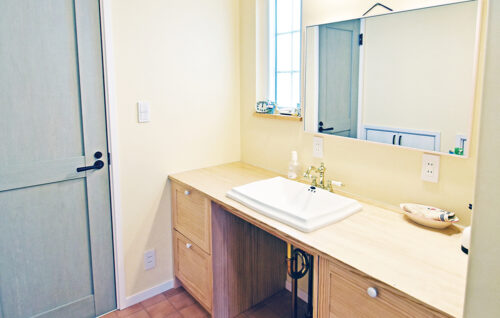 広い洗面カウンターに大きなミラーでオシャレな空間に