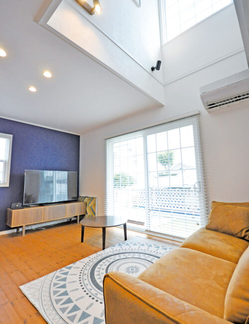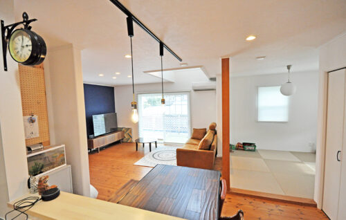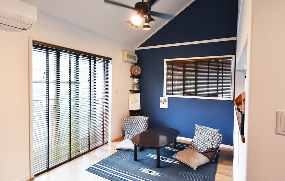 ▲ウォルナット色でまとめた、温かみのある無垢フローリング。
