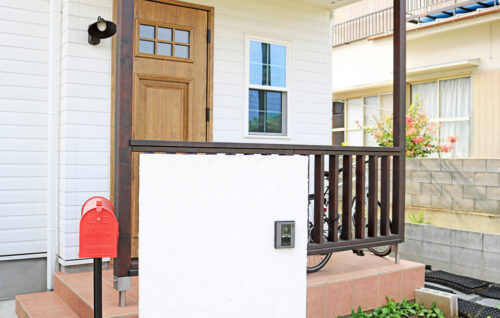 ▲木製ポーチ柱とウッドフェンスが似合う玄関ポーチ。
