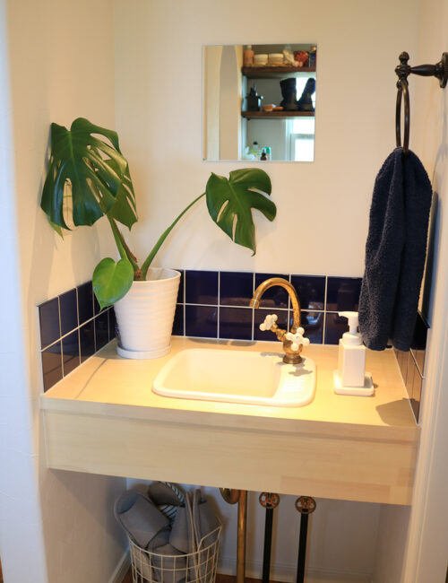▲アクセントタイルがオシャレなこだわりの造作洗面台。