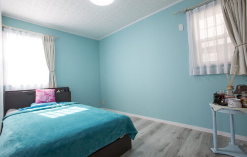 ▲ターコイズブルーの壁紙がオシャレな寝室。