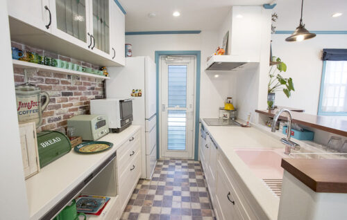 ▲キッチンは白を基調とし、タイル調のアクセントクロスでおしゃれに。