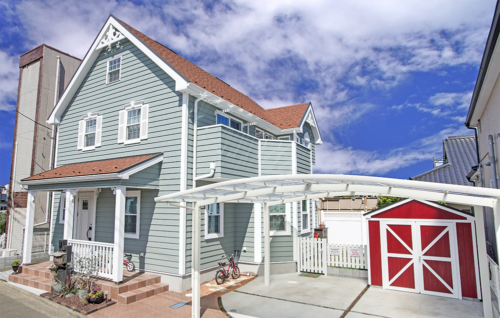 ▲アメリカンな飾りを玄関廻りや窓周りに使用したこだわりの外観