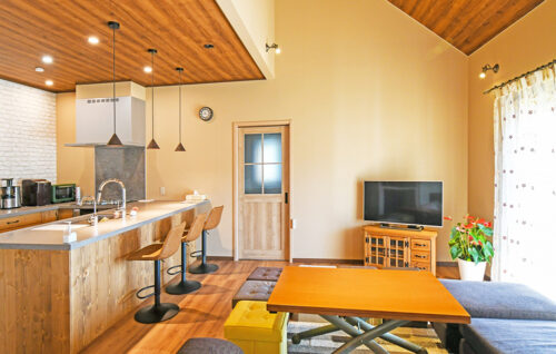 ▲天井の勾配とクロスがかっこいいリビングダイニング。